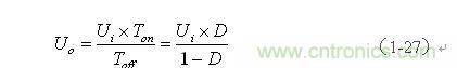 由(1-27)式可以看出,反轉(zhuǎn)式串聯(lián)開(kāi)關(guān)電源輸出電壓與輸入電壓與開(kāi)關(guān)接通的時(shí)間成正比,與開(kāi)關(guān)關(guān)斷的時(shí)間成反比,而與儲(chǔ)能電感L的大小無(wú)關(guān);與儲(chǔ)能電感L有關(guān)的是輸出電流的大小,電流的大小隱含在(1-21)、(1-25)、(1-26)式中。