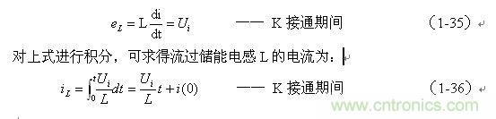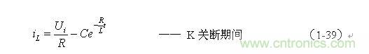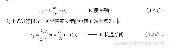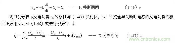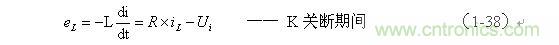 式中的負(fù)號表示反電動勢eL的極性與(1-35)式中的符號相反,即: K關(guān)斷期間電感L產(chǎn)生電動勢的方向與K接通期間電感L產(chǎn)生電動勢的方向正好相反。