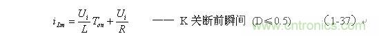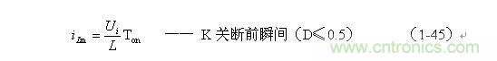 (1-44)式中iL為流過儲能電感L的電流(瞬時值),t為時間變量;i(0)為的初始電流,即:控制開關(guān)K接通前的瞬間流過儲能電感L中的電流。當(dāng)開關(guān)電源工作于電流臨界連續(xù)狀態(tài),或不連續(xù)電流狀態(tài)時(即D≤0.5),i(0) = 0 ,由此可以求得流過儲能電感L的最大電流為: