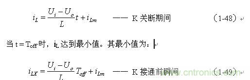 式中i(Ton+) 為控制開關(guān)K從Ton轉(zhuǎn)換到Toff的瞬間之前流過電感的電流,i(Ton+)也可以寫為i(Toff-),即:控制開關(guān)K關(guān)斷或接通瞬間,之前和之后流過電感L的電流相等。實(shí)際上(1-47)式中的i(Ton+) 就是(1-45)式中的iLm,因此,(1-47)式可以改寫為: