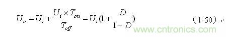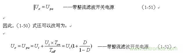 這里特別指出:(1-50)和(1-52)式的結(jié)果,雖然是以開關(guān)電源工作于電流臨界連續(xù)狀態(tài)的條件求得,但對于開關(guān)電源工作于連續(xù)電流狀態(tài)或斷流狀態(tài)同樣成立,因?yàn)椋敵鲭妷篣o是取自輸出脈沖電壓uo的半波平均值Upa,而不是取其平均值Ua。
