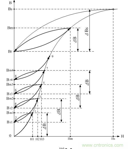 同理,當第二個直流脈沖加到變壓器初級線圈a、b兩端時,變壓器鐵芯中的磁感應強度B將按圖2-2中新的磁化曲線2-3上升,磁感應強度被磁場強度磁化到第二個最大值Bm2,使磁感應強度產生一個增量ΔB,