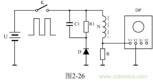 圖2-26中,U是電源電壓,通過控制開關K不斷地接通和關斷,就可以把電源電壓調制成單極性電壓脈沖;N為變壓器初級線圈,D為反激輸出整流二極管;R1為反激輸出負載電阻;C1為濾波電容;R為取樣電阻,通過測量R兩端的電壓,就可以知道流過變壓器初級線圈的電流;取樣電壓被送到示波器DP進行顯示。