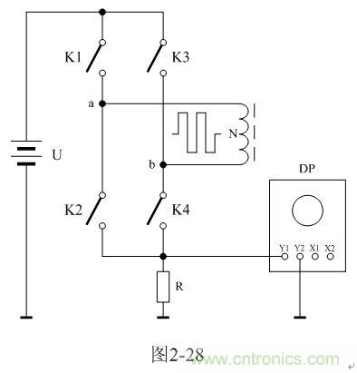 圖2-28中,U是電源電壓,N為變壓器初級(jí)線圈,控制開(kāi)關(guān)K1、K2、K3、K4組成橋式開(kāi)關(guān)控制電路,K1和K4為一組,K2和K3為一組,兩組開(kāi)關(guān)輪流接通與斷開(kāi),把電源電壓正反向加于變壓器初級(jí)線圈兩端;R為取樣電阻,通過(guò)測(cè)量R兩端的電壓,就可以知道流過(guò)變壓器初級(jí)線圈的電流;取樣電壓被送到示波器DP進(jìn)行顯示。