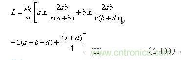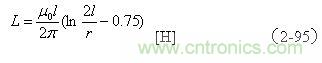 【說明】上式是用來計算變壓器線圈電感的計算公式。由于變壓器鐵芯的磁回路基本是封閉的,變壓器鐵芯的平均導磁率相對來說比較大。鐵芯的導磁率一般在產品技術手冊中都會給出,但由于大多數開關變壓器的鐵芯都留有氣隙,留有氣隙的磁回路會出現磁場強度以及磁感應強度分布不均勻,因此,(2-103)式中的導磁率只能使用平均導磁率,技術手冊中的數據不能直接使用。