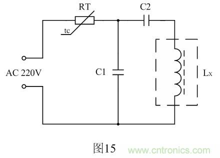 圖15中RT為熱敏電阻,Lx為小功率開關變壓器初級線圈,C1為分流電容,C2為限流電容。電容C1和C2的大小,需根據小功率開關變壓器初級線圈勵磁電流的大小來決定。一般消磁電流需要達到極限電流Imax的3~5倍。