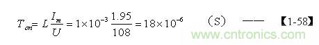 當占空比等于0.5時,對應的輸入電壓U為108V,對應的最大電流Im為1.95A,假設開關變壓器初級線圈的電感量L=1000uH,根據【1-45】式,可求得Ton的值為: