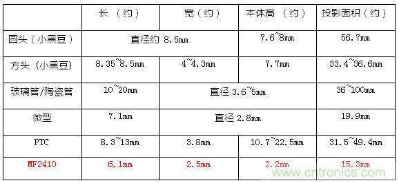 作為安規元件的保險絲,MF2410通用模塊保險絲滿足了上面的小體積和SMD工藝的需求。相對于傳統保險絲的尺寸,MF的體積小優勢十分明顯。