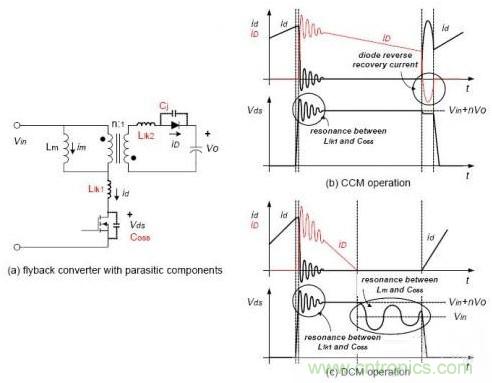 a.CCM模式時,只有開關管關斷時,由于漏感引起的震蕩(Lk和C);