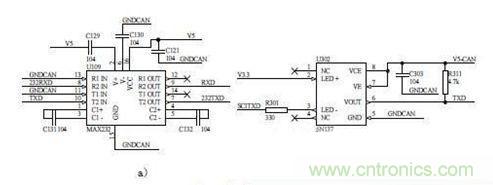 電池管理系統(tǒng)將采集處理后的數(shù)據(jù)通過(guò)串口發(fā)送到PC機(jī)界面上,實(shí)現(xiàn)人機(jī)交互。通過(guò)串口界面,可以觀察到電池的總電壓、單體電壓、電流、SOC、故障狀態(tài)、充放電功率等參數(shù),還可以通過(guò)串口發(fā)送實(shí)現(xiàn)管理系統(tǒng)的在線標(biāo)定。其硬件電路主要基于MAX232芯片,如圖3a)所示。