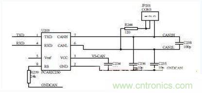 在電路中可根據(jù)整車(chē)要求,是否接入120Ω的終端電阻,當(dāng)JP201跳線接1腳和2腳時(shí),不接入電阻,當(dāng)接2腳和3腳時(shí),電阻接入。