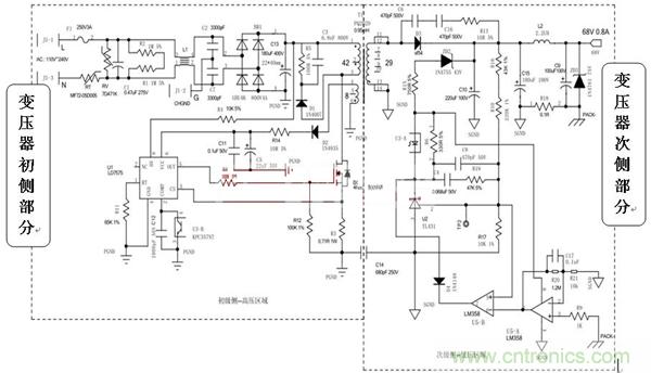 圖2是反激式開關電源的原理圖,就是在圖1框圖的基礎上,對各個部分進行詳細的設計,當然,這些設計都是按照一定步驟進行的。下面會根據(jù)這個原理圖進行各個部分的設計說明。