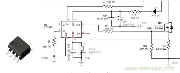 PWM集成IC的作用:500V高壓啟動電路;電流控制模式;VCC具有過壓保護功能;具備過載保護功能;500mA驅動能力;可調開關頻率;內置諧波補償電路。