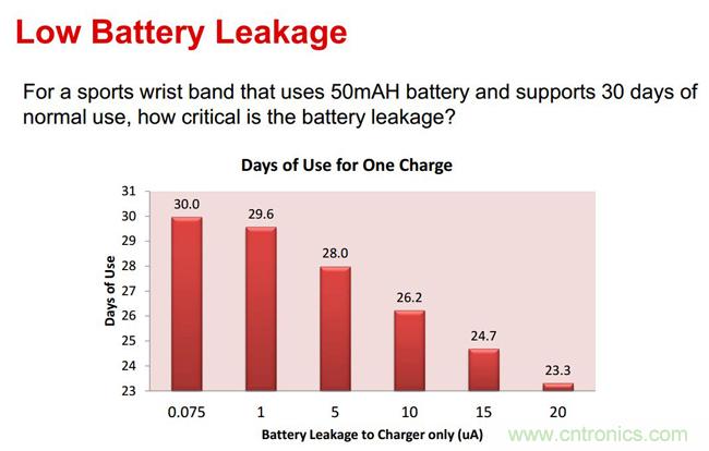 演講中,文博士還提到,可穿戴設(shè)備對于電池模塊的尺寸要求很小,對于電池精度的要求卻是日益提高,如何實(shí)現(xiàn)較小的充電終止電流,也是目前急需攻克的難題之一。“基于較小尺寸和充電終止電流的需求,TI推出了為可穿戴設(shè)備等低功耗應(yīng)用量身定制的鋰離子電池充電器:Bq25100。”文博士為我們介紹道,Bq25100采用了0.9×1.6毫米的WCSP封裝,可支持尺寸僅為前代一半的充電器解決方案;Bq25100可以對低至10mA或高達(dá)250mA的快速充電電流進(jìn)行準(zhǔn)確控制,同時(shí)還可實(shí)現(xiàn)低至1mA的充電終止,從而支持微型鋰離子紐扣電池。此外,Bq25100還支持不足75nA的漏電流,可解決因漏電流帶來的電池?fù)p耗問題,延長電池使用時(shí)間。