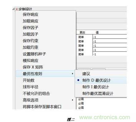篩選設計是指在問題研究的早期,潛在的候選因素很多,如何有效地大規模降低實驗次數而又準確地找到少數幾個影響發動機性能的關鍵因素。具體的實現手段有兩種:一種是經典的實驗設計方法,如部分析因設計、Plackett-Burman設計等(如圖一所示);另一種是高級的實驗設計方法,如D最優設計等(如圖二所示)。