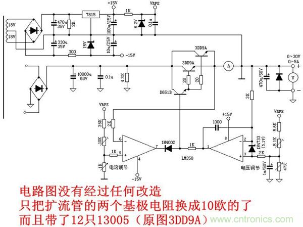 一般電源都用2N3055擴流,可是我要是用的話3055得現買剛好查資料13005也可以做擴流,而且手頭又有一大批電子鎮流器,基本上都是一批下來的,剛好參數也差不多就廢物利用了,整個電源改造沒花一分錢就是耗時,估計得四天以上。