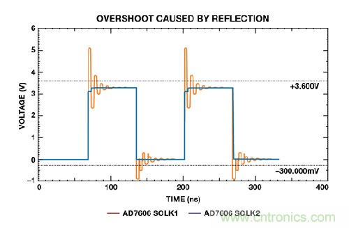 在圖8 中,SCLK1 上的大過沖違反了–0.3 V 至+3.6 V 的絕對最大額定值。串聯電阻可減小SCLK2 上的壓擺率,使信號處于額定值之內。
