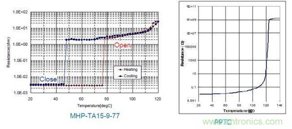 因此,不論哪種方式的快速充電,都是通過提高充電電流或功率來加速鋰電池芯內(nèi)部的反應(yīng)來實(shí)現(xiàn)的,必須通過更多的保護(hù)來防止由于電池芯的熱失控而引起的起火甚至爆炸。TE的PPTC和MHP-TA 可以有效地提供這種保護(hù),MHP-TA是結(jié)合了雙金屬片和PPTC的溫度/電流保護(hù)器件,溫度保護(hù)更加精確,可以適用于電流較大、溫度保護(hù)要求更高的電子設(shè)備,如:智能手機(jī)、平板電腦、超級(jí)本、筆記本電腦等。MHP-TA及PPTC的特性及應(yīng)用如下圖,緊貼電池芯的設(shè)計(jì)可以使MHP-TA和PPTC更好的感測(cè)電池溫度,當(dāng)電池溫度異常升高時(shí)可以呈現(xiàn)高阻,阻礙電池的充放電電流,確保電池的安全使用。