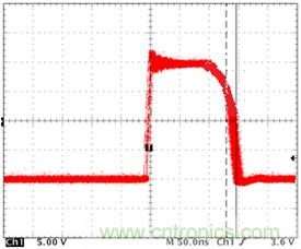 測(cè)試的目的是看上MOS管導(dǎo)通時(shí),有沒(méi)有同時(shí)把下管打開,從而導(dǎo)致電源直接導(dǎo)通到地而引起短路。如圖三所示藍(lán)色曲線(Vgs_Lmos)就是下管在上管導(dǎo)通的同時(shí),被帶了起來(lái),如果藍(lán)色曲線的被帶起來(lái)的尖峰超過(guò)了MOS管的Vth要求,同時(shí)持續(xù)時(shí)間(Duration)也超過(guò)了datasheet要求,從而就會(huì)有同時(shí)導(dǎo)通的風(fēng)險(xiǎn)。當(dāng)然,這是大家最常見(jiàn)到的情況。