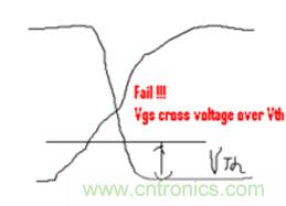 下面這種情況有非常多的人會(huì)忽視,甚至是一些比較有經(jīng)驗(yàn)的電源測(cè)試工程師。下面組圖四是下管打開,上管關(guān)閉時(shí)候的波形(圖4-1是示意圖,圖4-2示實(shí)際測(cè)試圖)。雖然沒(méi)有被同時(shí)帶起的情況,但是請(qǐng)注意上下管有交叉的現(xiàn)象,而且交叉點(diǎn)的電平遠(yuǎn)高于MOS管規(guī)定的Vth值,這是個(gè)嚴(yán)重的shoot through現(xiàn)象。最直接的后果就是MOS管燒毀!