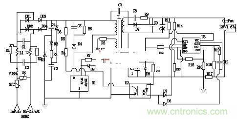 具體的工作原理是:NCS1002調(diào)節(jié)輸出的電壓值,當輸出電壓超過設定電壓值時,電流流向光耦LED,從而下拉光耦中晶體管的電流。當電流超過TNY279的使能引腳的閾值電流時,將抑制下一個周期,當下降的電壓小于反饋閾值時,會使能一個開關(guān)周期,通過調(diào)節(jié)使能周期的數(shù)量,對輸出電壓進行調(diào)節(jié),同樣,當通過檢測到R16上的電流即輸出電流大于設定的值時,電流通過另一個二極管下拉光耦LED中晶體管的電流,達到抑制TNY279的下一個周期的目的,當輸出電流小于設定電流時會使能一個開關(guān)周期,通過這樣的反饋調(diào)節(jié)機制,能使得輸出的電壓和電流都處于穩(wěn)定的狀態(tài)。