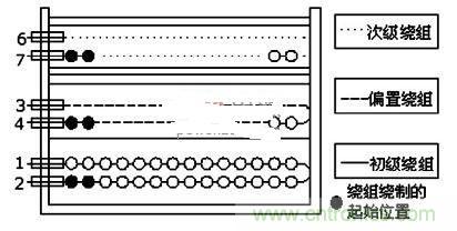 圖3:變壓的初級、次級和偏置繞組的繞制示意圖