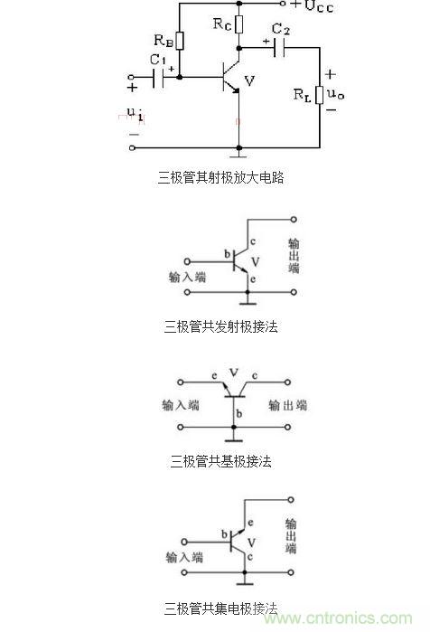 為了更進一步的說明這種三極管開關(guān)電路的設(shè)計原理,在這里我們以NPN三極管的共發(fā)射極放大電路為例,來具體的說明一下。下圖中所提供的三種連接方式是三極管放大電路最常見的,除了共發(fā)射極聯(lián)接方式外,還有共集電極和共基極聯(lián)接方式。
