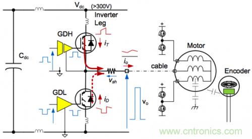 三相逆變器是一種功率電子開關(guān)電路,控制功率從直流供電軌到三個交流電機繞組的流動。逆變器有三條相同的腿,每條腿包括兩個IGBT晶體管和兩個二極管,如圖1所示。每個電機繞組均連接至通過分流器連接高端晶體管和低端晶體管的同一節(jié)點。逆變器使電機繞組在直流總線的高壓軌和低壓軌之間切換,以控制平均電壓。繞組具有極高的電感性,將阻擋電流的變化,因此,當(dāng)功率晶體管關(guān)閉時,電流將開始在連接至相反電源軌的二極管中流動。這樣,即使逆變器功率設(shè)備和直流鏈路電容中存在斷續(xù)傳導(dǎo),也會有電流連續(xù)流到電機繞組中。電機繞組阻抗充當(dāng)來自逆變器的高壓脈沖寬度調(diào)制方波輸出電壓的低通濾波器。將低壓控制電流連接至逆變器時存在巨大的困難。一個基本問題是,高端晶體管發(fā)射器節(jié)點在高壓總線高供電軌與低供電軌之間切換。首先,高端驅(qū)動器必須能夠驅(qū)動相對于一個發(fā)射器(可能比共用輸入信號高300 V或以上)的柵極信號。其次,通過分流器(vsh)的電機電流信號必須從300 V或以上的共模電壓中提取出來。其他問題將由電源電路中的寄生元件導(dǎo)致。當(dāng)功率晶體管或二極管的開關(guān)頻率超過1 A/ns時,即使是10 nH的PCB走線電感也可能導(dǎo)致顯著的電壓(>10 V)。寄生電感和部件電感會導(dǎo)致振鈴,結(jié)果使設(shè)備開關(guān)產(chǎn)生的噪聲脈沖的持續(xù)時間變長。甚至電機電纜的高頻阻抗也可能帶來問題,因為出于安全考慮,配電板可能離電機很遠(yuǎn)。其他效應(yīng)包括噪聲從電機耦合到反饋傳感器信號中,其原因是快速切換的繞組電壓波形。問題將變得更加嚴(yán)重,因為驅(qū)動電路的功率額定值將增加電路板的物理尺寸,結(jié)果將進(jìn)一步增加寄生電感,甚至提高電流和電壓開關(guān)速率。