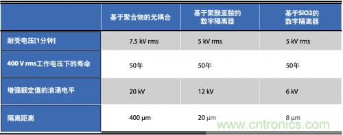安全標(biāo)準(zhǔn)通常規(guī)定1分鐘耐壓額定值(典型值2.5 kV rms至5 kV rms)和工作電壓(典型值125 V rms至400 V rms)。某些標(biāo)準(zhǔn)也會規(guī)定更短的持續(xù)時間、電壓浪涌(如10 kV峰值并持續(xù)50 µs)作為增強絕緣認(rèn)證的一部分要求。聚合物/聚酰亞胺隔離器可提供最好的隔離特性(見表1)。聚酰亞胺數(shù)字隔離器與光耦合器類似,在典型工作電壓下,工作壽命超過電機,額定使用壽命為50年。SiO2隔離器的工作壽命與之接近,但是,對高能浪涌的保護(hù)能力卻較弱。