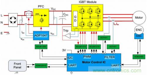 展示了柵極驅(qū)動、通信和反饋信號隔離的典型驅(qū)動電路如圖4所示。在該系統(tǒng)中,隔離的Σ-Δ ADC用來測量電機繞組電流,數(shù)字位流則由電機控制IC上的數(shù)字過濾電路進(jìn)行處理。位置編碼器包含一個ASIC,由其通過一個隔離式RS-485接口將位置和速度數(shù)據(jù)發(fā)送給電機控制IC。其他隔離式串行接口包括連接PFC的I2C接口以及連接前面板的隔離式RS-232鏈路。在此例中,PWM信號與逆變器模塊隔離,IGBT由一個嵌入該模塊中的電平轉(zhuǎn)換柵極驅(qū)動器驅(qū)動。