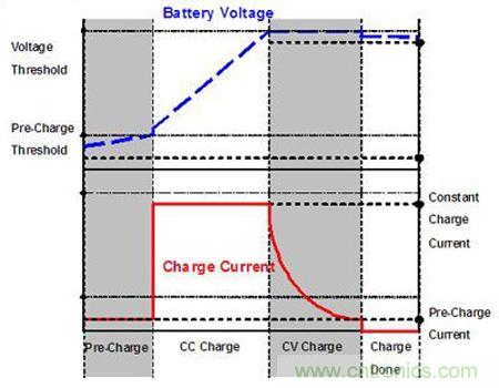 因鋰離子電池的特性,若鋰離子電池在充電之前已深度放電,此時充電器會先以微弱電流對電池進行Pre-Charge充電(各家廠商設定值不同,本文使用范例的充電IC設定值約為10%的最大充電電流),充電時電池電壓上升。