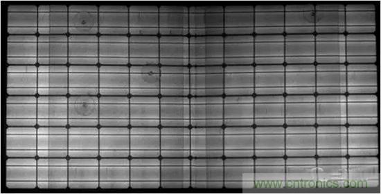 給晶硅組件施加電壓后,所激發(fā)出的電子和空穴復合的數(shù)量越多,其發(fā)射出的光子也就越多,所測得的EL圖像也就越亮;如果有的區(qū)域EL圖像比較暗,說明該處產生的電子和空穴數(shù)量較少(例如圖3中電池中部),代表該處存在缺陷(復合中心);如果有的區(qū)域完全是暗的,代表該處沒有發(fā)生電子和空穴的復合(圖3和圖4中紅線所標處),也或者是所發(fā)光被其它障礙所遮擋(圖3和圖4主柵線處),無法檢測到信號。
