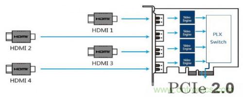 針對圖三中主流的四通道架構,PLX Switch可以選擇PEX8608,客戶如果有更多通道需求,如八通道,建議選擇PEX8618,但具體要根據客戶數據量來決定,系統架構完全一致,對項目來說,只需要更換PCIE Switch就可以滿足不同應用需求,軟件方面無需改動,加速上市時間,搶占市場。