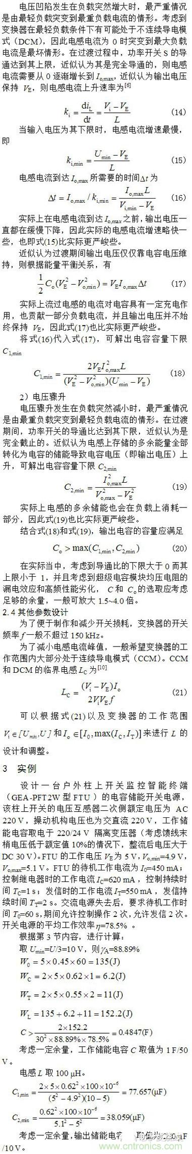 根據能量平衡關系,分析了負載突然增大和負載突然減輕情況下的最嚴重電壓凹陷和電壓驟升,并得出輸出濾波電容容量的設計考慮。以一個具體的電容儲能FTU電源為例,詳細說明了電路參數的設計方法,并進行了實驗研究。實驗結果表明所設計的電容儲能備用電源能夠滿足在失去正常供電電源后自動化終端待機、操作和通信的需要,并且所進行的理論分析與實際情況相符。