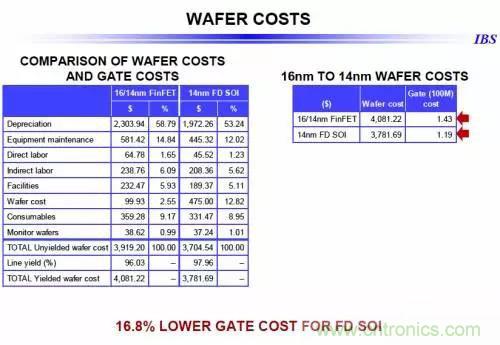 IBS 首席執行官Handel Jones則比較了16/14納米FinFET與14納米FD SOI的晶圓成本與單位晶體管成本,根據他的計算,14納米FD-SOI工藝單位晶體管成本比相應的FinFET工藝低了近17%。