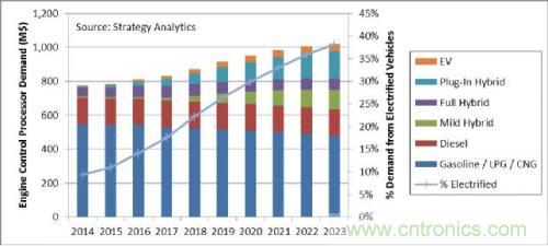 在這些發(fā)動(dòng)機(jī)控制應(yīng)用程序當(dāng)中,來自電動(dòng)汽車動(dòng)力系統(tǒng)的處理器需求增速遠(yuǎn)遠(yuǎn)高于傳統(tǒng)汽油和柴油動(dòng)力汽車。如上圖所示,到 2023 年,超過 37% 的發(fā)動(dòng)機(jī)控制處理器需求將來自電動(dòng)汽車。這個(gè)比例明顯高于電動(dòng)汽車 15% 的產(chǎn)量份額,因?yàn)椴簧匐妱?dòng)汽車都是混合動(dòng)力汽車,同時(shí)需要對汽油/柴油發(fā)動(dòng)機(jī)和電動(dòng)機(jī)/變頻器/電池進(jìn)行控制。