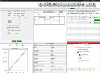 使用這個組件時,一些設計參數已輸入該工具中。組件的左側顯示參數名稱,中間供用戶輸入,右側顯示適用于該特定負載開關的數值范圍。單擊“Open Design”(打開設計)按鈕將啟動WEBENCH工具。顯示結果類似于圖3所示。