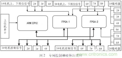 專用控制器由arm(LPC2214)、fpga(EP2C5T144C8)、驅(qū)動器接口電路、編碼器接口電路、限位檢測電路和電源電路等組成,如圖2為一個八軸電機控制器的硬件組成圖。arm通過串口實現(xiàn)與上位機之間的通信,解析從上位機獲得的控制指令,并通過fpga產(chǎn)生相應(yīng)輸出信號給驅(qū)動器接口,驅(qū)動器接口外接驅(qū)動器。編碼器信號作為位置反饋信號同編碼器接口相連,形成位置環(huán)反饋。限位信號作為安全檢測信號同限位檢測接口相連,為整個系統(tǒng)添加一道安全保障。