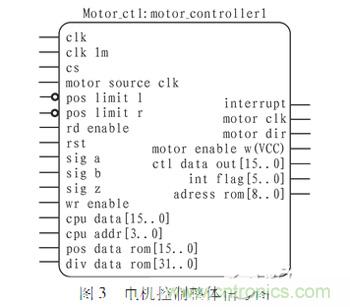 專用控制器在完成整個控制的過程中,arm只負(fù)責(zé)指令解析、控制指令發(fā)送、實時數(shù)據(jù)上傳等任務(wù),fpga才是多軸專用控制器的核心。通過Verilog HDL語言在fpga內(nèi)部實現(xiàn)了加減速曲線、編碼器信號辯向及四細(xì)分、絕對位移記錄等功能。圖3為電機控制的整體輸入、輸出信號圖,通過片選信號CS、讀有效信號rd_enable、寫有效圖信號wr_enable進行電機通道選擇。圖4給出了1#通道控制的fpga內(nèi)部邏輯示意圖,下面將逐一對各主要模塊進行詳細(xì)介紹。
