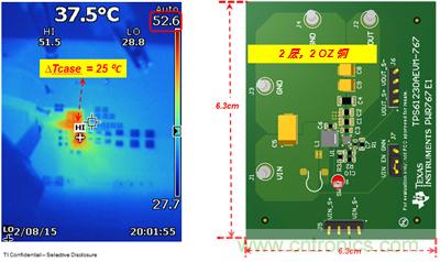 TPS61230A基于谷值限流模式控制方案,最小開關(guān)電流為4.8A。該器件集成了兩個低RDS(on)FET(18mΩ/高速,21mΩ/低速),這使其具有更高的效率和更良好的熱性能。在室溫條件下,VIN = 3.6V,VOUT = 5.0V,IOUT = 2.0A時,只能實(shí)現(xiàn)25℃的升溫,如圖3所示。