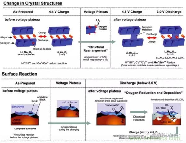 富鋰材料容量高,并且還具有低成本的優(yōu)勢,可以說是非常理想的鋰離子電池正極材料,當然任何事情都不可能是完美的,在首次使用的過程中為了發(fā)揮出富鋰材料的高容量,要采用高電壓活化,這一過程中除了形成我們需要的Li2MnO3物相外,也會生成Li2O,還會釋放活性氧,這不僅會破壞富鋰材料自身的結構,還會導致電解液的氧化分解,造成較高的不可逆容量。此外富鋰材料在循環(huán)過程中還存在著層狀結構向尖晶石結構轉變的趨勢,這也導致富鋰材料的電壓平臺在循環(huán)過程中會持續(xù)的下降,容量不斷衰減,使得富鋰材料循環(huán)性能較差,反應機理如下圖所示。