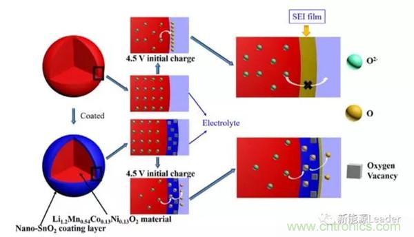 富鋰材料界面穩(wěn)定性差,容易導致副反應的發(fā)生,影響電池的循環(huán)壽命,一種有效的解決辦法就是“表面包覆”,例如AlF3、Al2O3和Li3PO4等材料都可以用于富鋰材料的表面包覆,改善富鋰材料的表面穩(wěn)定性。哈工大的杜春雨等等提出了一種SnO2包覆方案,他們利用了SnO2中的氧缺位,促進Li2MnO3結構的形成,不僅改善了富鋰材料的循環(huán)性能和倍率性能,還提高了富鋰的材料的容量,達到了264.6mAh/g,相比于沒有包覆處理的富鋰材料提高了38.2mAh/g,這也為富鋰材料表面改性處理提供了一個新的思路。