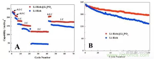 華南師范大學的Dongrui Chen等借助聚多巴胺模版法,利用Li3PO4對富鋰材料進行了包覆處理,Li3PO4包覆層的厚度僅為5nm左右。Li3PO4包覆層極大的改善了富鋰的材料的循環(huán)性能,0.2C,2.0-4.8V循環(huán)100次,容量保持率為78%,而沒有經過包覆處理的富鋰材料容量保持率僅為58%,同時Li3PO4包覆層也顯著提高了富鋰的材料的倍率性能,如下圖所示。