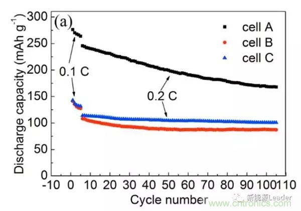富鋰材料的低溫性能也是阻礙富鋰材料應用的一個重要因素,中國工程物理研究院的Guobiao Liu等對于富鋰材料低溫下容量下降的機理做了詳細的研究,一般認為,富鋰材料在低溫下由于活化產生的Li2MnO3材料的數(shù)量較少,導致容量偏低,但Guobiao Liu的研究發(fā)現(xiàn),即便是材料內的Li2MnO3含量較高,在低溫下容量發(fā)揮也很低,Li2MnO3含量并不是影響材料容量發(fā)揮的決定性因素,Guobiao Liu認為低溫下較差的電極動力學特性會抑制Mn4+/Mn3+反應,從而導致材料的容量發(fā)揮較低。循環(huán)性能研究顯示,雖然低溫導致富鋰材料的容量發(fā)揮較低,但是卻顯著的提升了富鋰材料的循環(huán)性能,如下圖所示(電池A在25℃下循環(huán),含有較多數(shù)量的Li2MnO3,電池B,在低溫-20℃下循環(huán)含有較少數(shù)量的Li2MnO3,電池C首先在25℃下活化,然后在-20℃下循環(huán),含有數(shù)量較多的Li2MnO3)。A、B和C三種電池在循環(huán)100次后,容量保持率分別為68.3%、80.9%和88.1%,通過對三種電池中的富鋰材料的結構研究顯示,低溫很好的抑制了富鋰材料從層狀結構向尖晶石結構轉變,從而顯著改善了富鋰材料的循環(huán)性能。