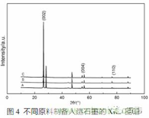 圖4是不同原料、相同制備工藝制成的三種人造石墨A、B、C的XRD圖譜,由圖4可知:A、B、C三種材料的主峰位置基本相同,均位于26°2θ角附近,說(shuō)明經(jīng)過(guò)高溫石墨化處理后的A、B、C三種材料形成了石墨晶體的六方晶型結(jié)構(gòu)。