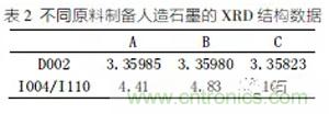 表2是不同原料制備人造石墨的XRD結(jié)構(gòu)數(shù)據(jù),由數(shù)據(jù)可知:A、B、C三種材料的D002值依次減少,說(shuō)明三種材料的石墨化程度依次升高;I004/I110值依次升高,說(shuō)明三種材料的取向性依次變差。這與原料的偏光測(cè)試結(jié)果是一致的。取向性好的材料嵌鋰的速度更快。