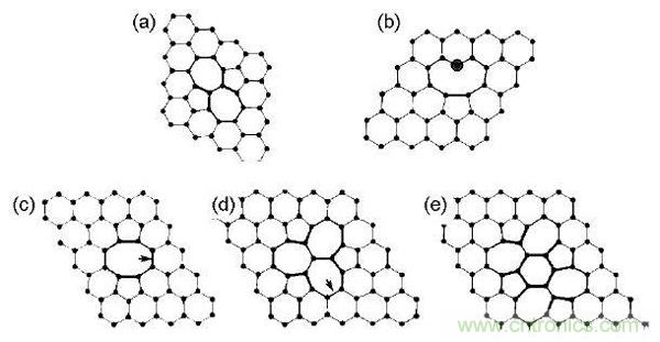圖2.不同種類石墨烯缺陷:(a)S-W缺陷;(b)V1缺陷;(c)585-V2缺陷;(d) 555777-V2 缺陷;(e) 555-6-777-V2缺陷
