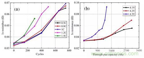 對(duì)電池的動(dòng)態(tài)內(nèi)阻分析如下圖所示,從圖a測(cè)試結(jié)果來(lái)看,當(dāng)充電電流小于1C時(shí),電池動(dòng)態(tài)內(nèi)阻隨著電池循環(huán)的變化趨勢(shì)幾乎時(shí)一樣的,但是當(dāng)充電電流超過(guò)1C時(shí),電池動(dòng)態(tài)內(nèi)阻增加速度會(huì)隨著充電速率的增加而快速增加。從圖b的測(cè)試結(jié)果來(lái)看,當(dāng)充電截止電壓為4.3V時(shí),電池動(dòng)態(tài)內(nèi)阻增加非常迅速表明高截止電壓會(huì)惡化電池的動(dòng)力學(xué)條件,截止電壓為4.1V和4.2V時(shí)電池動(dòng)態(tài)內(nèi)阻增加較為緩慢。