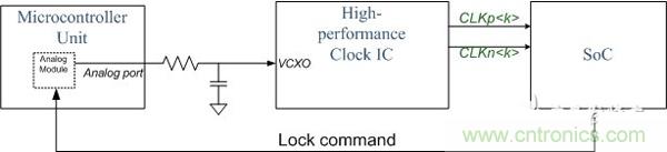 對某些應用而言,輸出時鐘頻率應通過使用模擬反饋跟蹤輸入數據流。如圖 5 所示,時鐘 IC 作為大鎖相環的一部分。ASIC 或 SoC 負責跟蹤輸入流、計算誤差并產生 PWM 信號(通常來說),隨后將誤差信息反饋至本地時鐘發生器以進行頻率調諧。