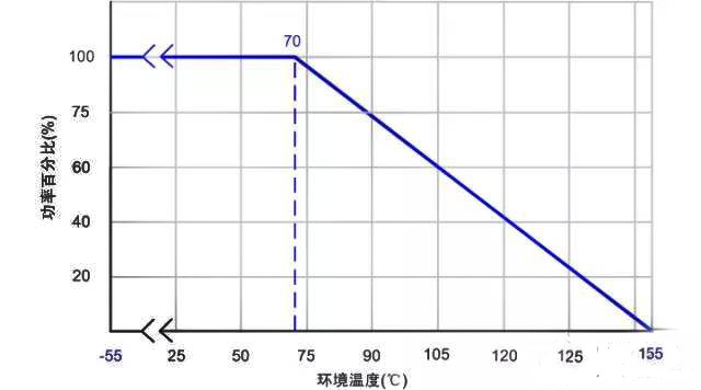 而最大工作電壓是在額定功率下,該電阻可以承受的最大電壓。但是要注意!看下面這個圖。可以看出額定功率是在最高環境溫度70度的條件下標注的(不同廠家,系列可能有微小區別,在設計之初和問題查找的時候應該核實清楚。)